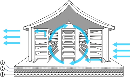The clay floors with layers of charcoal, powdered lime, salt and sand help adjust humidity: the floors absorb moisture if the air is too humid in the summer and release it if the air is dry in winter.